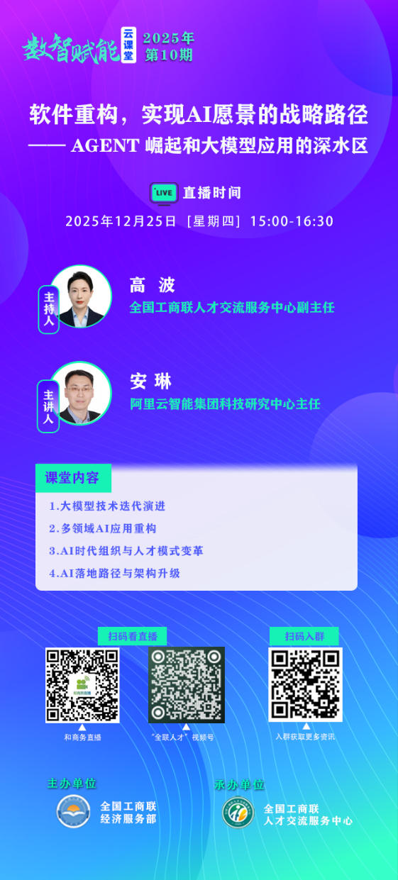 由全国工商联经济服务部主办,全国工商联人才交流服务中心承办的2025年“数智赋能云课堂”第10期将于12月25日15:00-16:00正式开播。